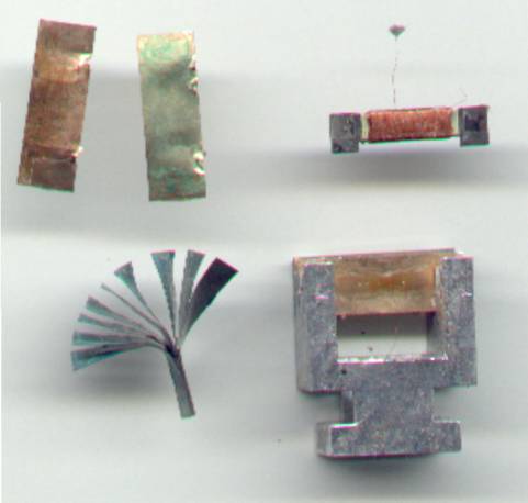 The photo on the right shows the face of the pole piece assembly with the upper track and spacer pulled away from the center crosstalk shield. At the very top, one lamination has been peeled away from the gap area. Note the C-shaped clamps around the outer edges of the lamination stacks. I believe this is part of the fixturing/tooling that holds the lamination stacks during lapping of the gap and prior to the final contouring of the pole tip outlines.